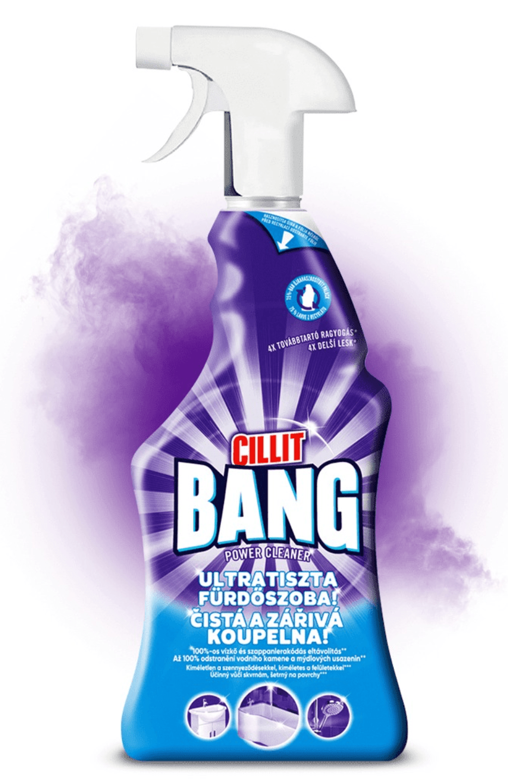 Med Cillit Bang holdes dit badeværelse rent og skinnende i længere tid! Det effektive rengøringsmiddel til badeværelset fjerner pletter nemt og ubesværet. Den supereffektive formel er specifikt udviklet til hurtig fjernelse af kalk, sæberester og snavs, og anti-belægningsteknologien bidrager til, at pletterne ikke kommer igen. Formlen er effektiv mod snavs, men skånsom mod overfladerne.
